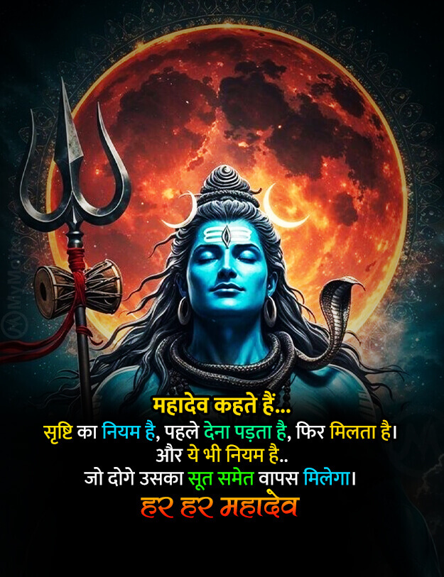 महादेव कहते हैं... सृष्टि का नियम है, पहले देना पड़ता है, फिर मिलता है। और ये भी नियम है.. जो दोगे उसका सूत समेत वापस मिलेगा। हर हर महादेव🙏🙏🙏🙏🙏