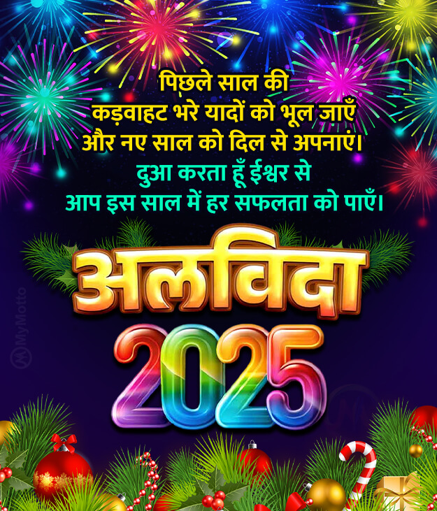 पिछले साल की कड़वाहट भरे यादों को भूल जाएँ और नए साल को दिल से अपनाएं।दुआ करता हूँ ईश्वर से आप इस साल में हर सफलता को पाएँ।अलविदा 2025