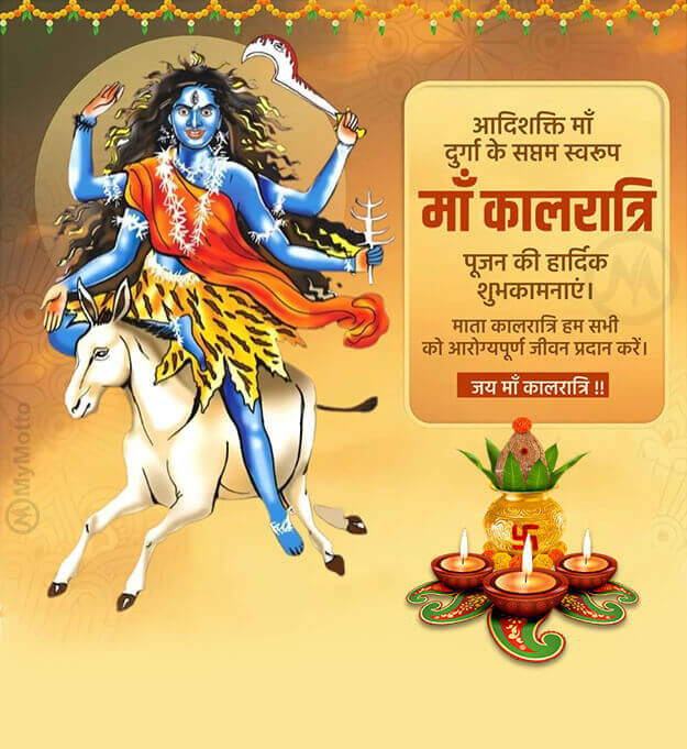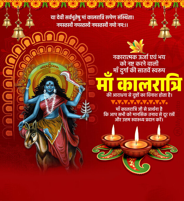 या देवी सर्वभूतेषु मां कालरात्रि रूपेण संस्थिता। नमस्तस्यै नमस्तस्यै नमस्तस्यै नमो नमः ।।नकारात्मक ऊर्जा एवं भय को नष्ट करने वाली माँ दुर्गा की सातवें स्वरूपमाँ कालरात्रि की आराधना से दुष्टों का विनाश होता है।माँ कालरात्रि जी से प्रार्थना है कि आप सभी को मानसिक तनाव से दूर रखें और उत्तम स्वास्थ्य प्रदान करें।