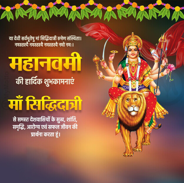 या देवी सर्वभूतेषु मां सिद्धिदात्री रुपेण संस्थिता। नमस्तस्यै नमस्तस्यै नमस्तस्यै नमो नमः।महानवमी की हार्दिक शुभकामनाएंमाँ सिद्धिदात्री से समस्त देशवासियों के सुख, शांति, समृद्धि, आरोग्य एवं सफल जीवन की प्रार्थना करता हूं।