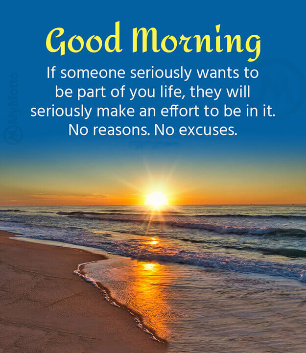 Good MorningIf someone seriously wants to be part of you life, they will seriously make an effort to be in it.No reasons. No excuses.