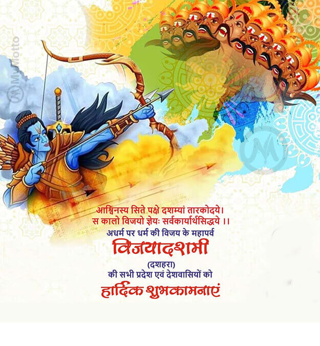आश्विनस्य सिते पक्षे दशम्यां तारकोदये। स कालो विजयो ज्ञेयः सर्वकार्यार्थसिद्धये ।। अधर्म पर धर्म की विजय के महापर्व विजयादशमी (दशहरा) की सभी प्रदेश एवं देशवासियों को हार्दिक शुभकामनाएं